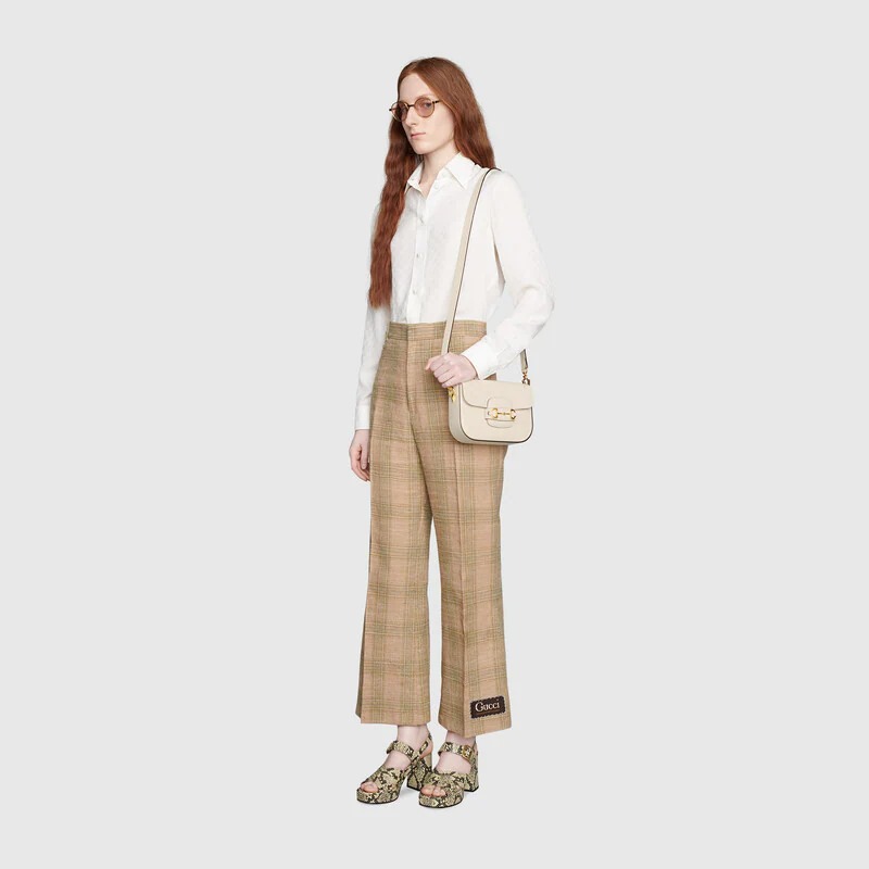 Petite versions of the Gucci Horsebit 1955 add a hybrid twist to the vintage inspired line. Enriched with two different shoulder straps, the black leather mini bag’s character transforms from understated elegance with a tonal leather strap to a strong logo feel thanks to a red and green Web option.