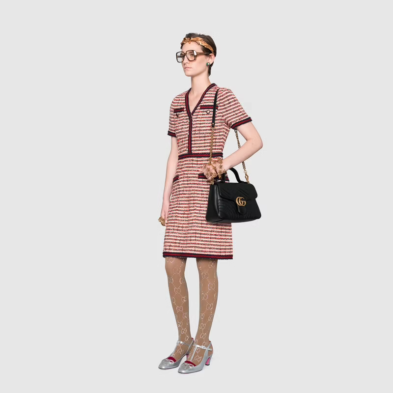The small GG Marmont top handle bag has a softly structured shape and an oversized flap closure with Double G hardware. Made in matelassé chevron leather with a heart on the back.